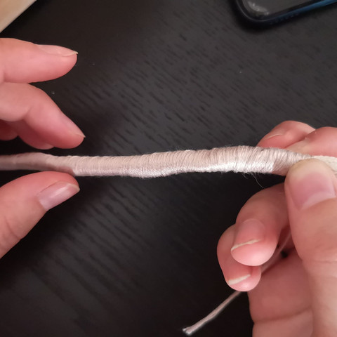 Personnellement, j'ai pris une longueur d'environ 20cm, puis ai plié la corde 4 fois, de manière à avoir 5 épaisseurs, comme sur la photo, pour réaliser le premier cercle de l'arc en ciel.